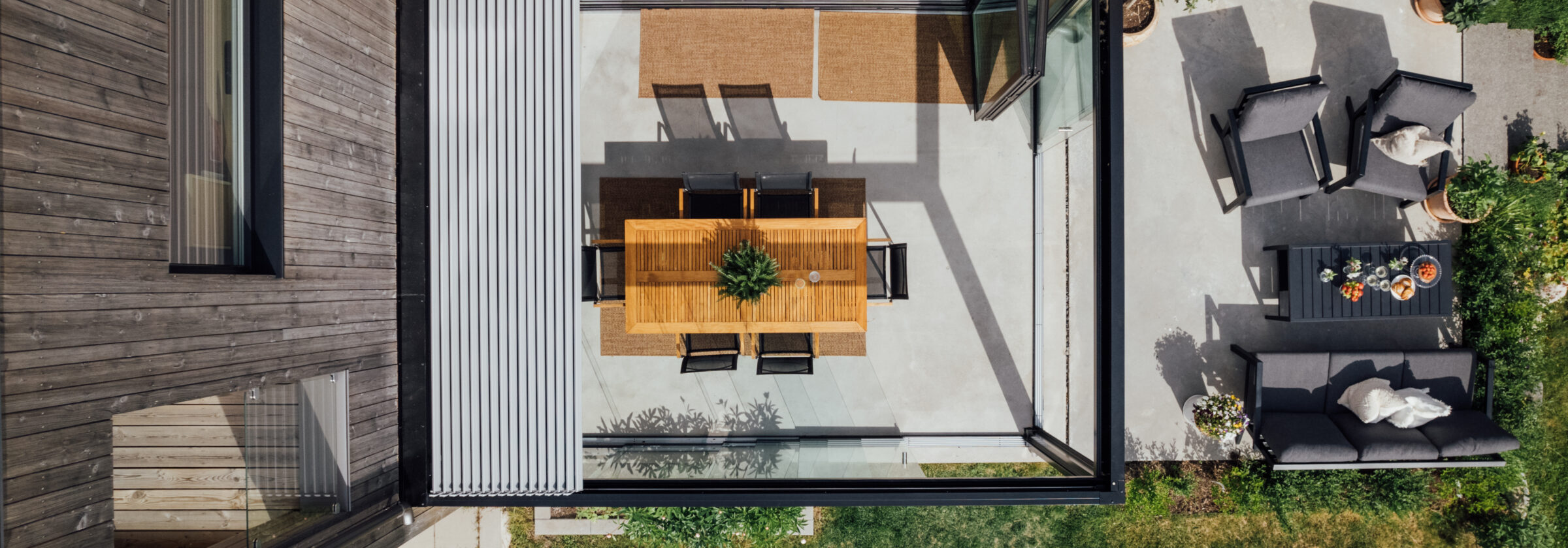 En pergola med skyvbare lameller er perfekt for deg som ønsker å kunne veksle mellom åpen himmel og lukket tak over uteplassen.