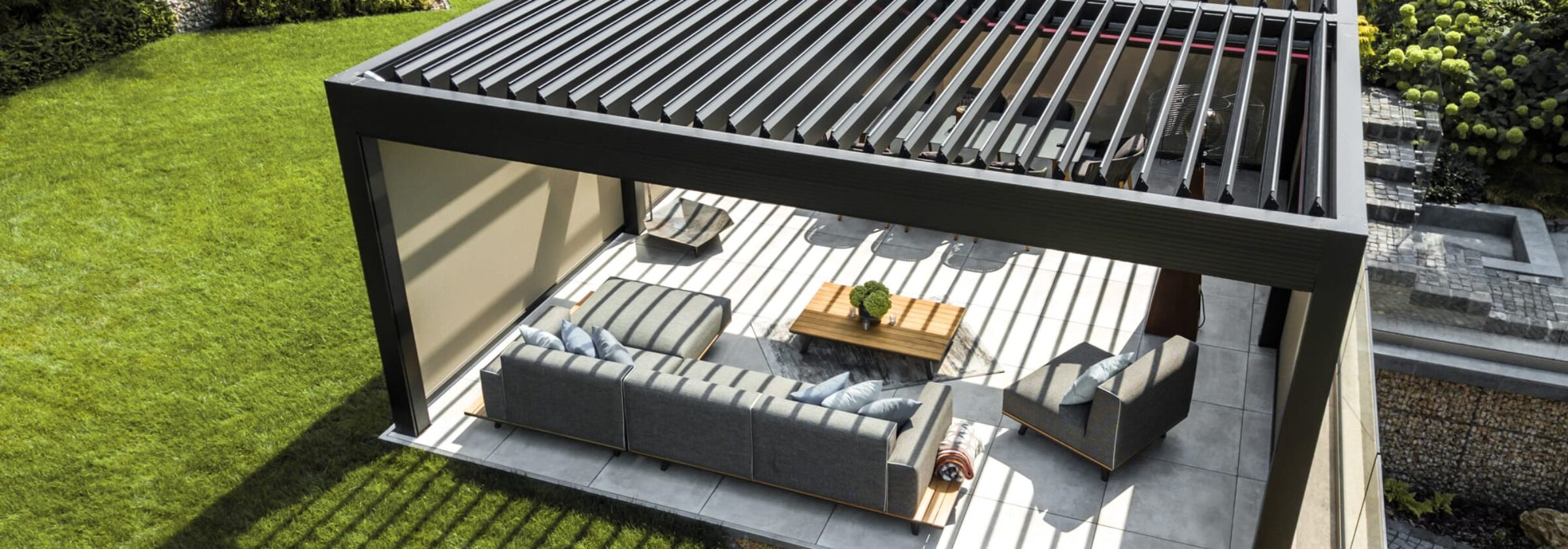 Vis produktVår bestselgende helårs pergola med roterbare lameller. Her kan du la møblene stå ute hele året.