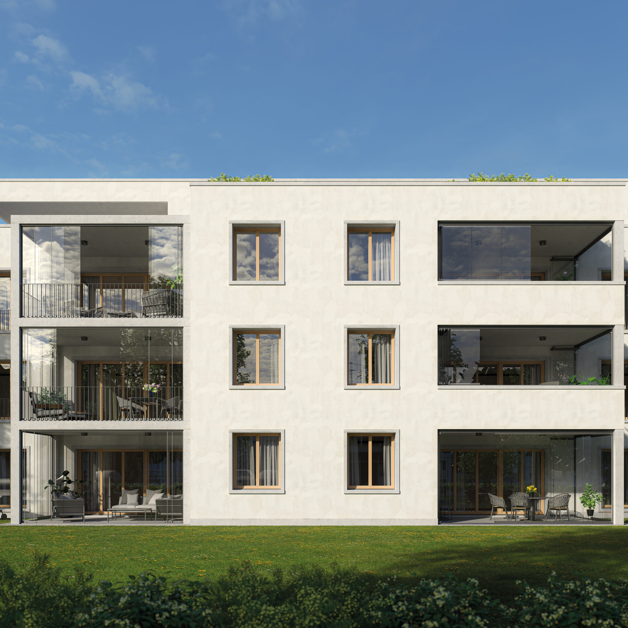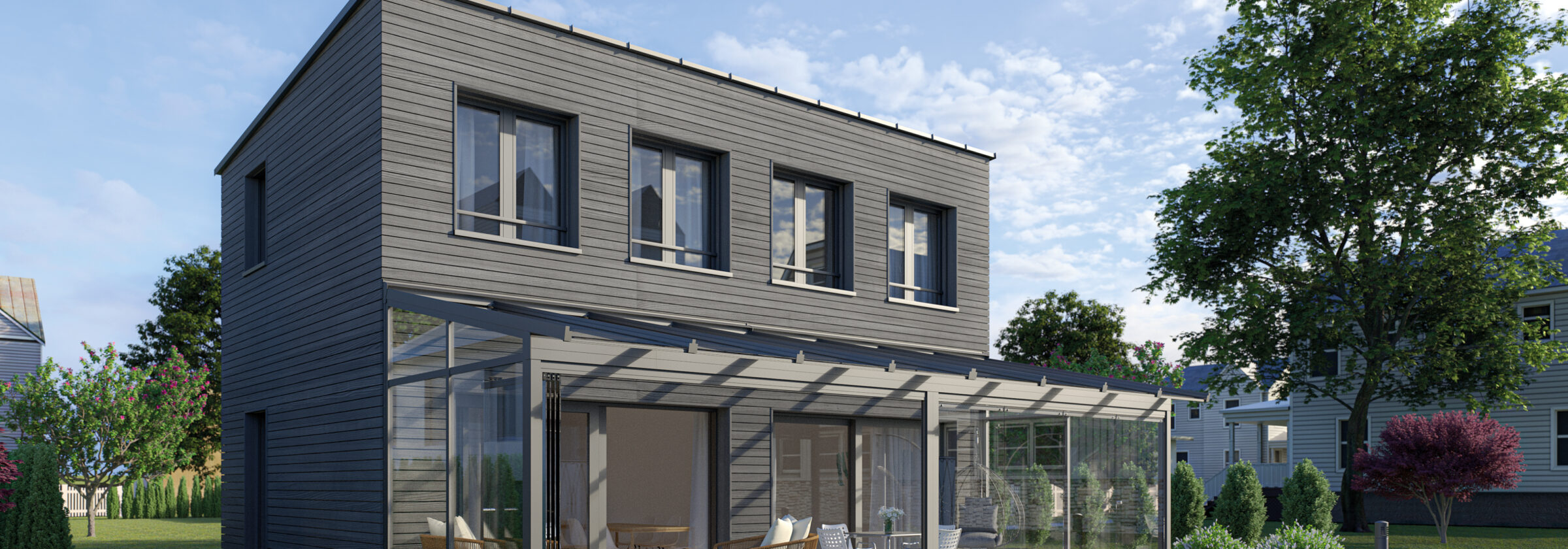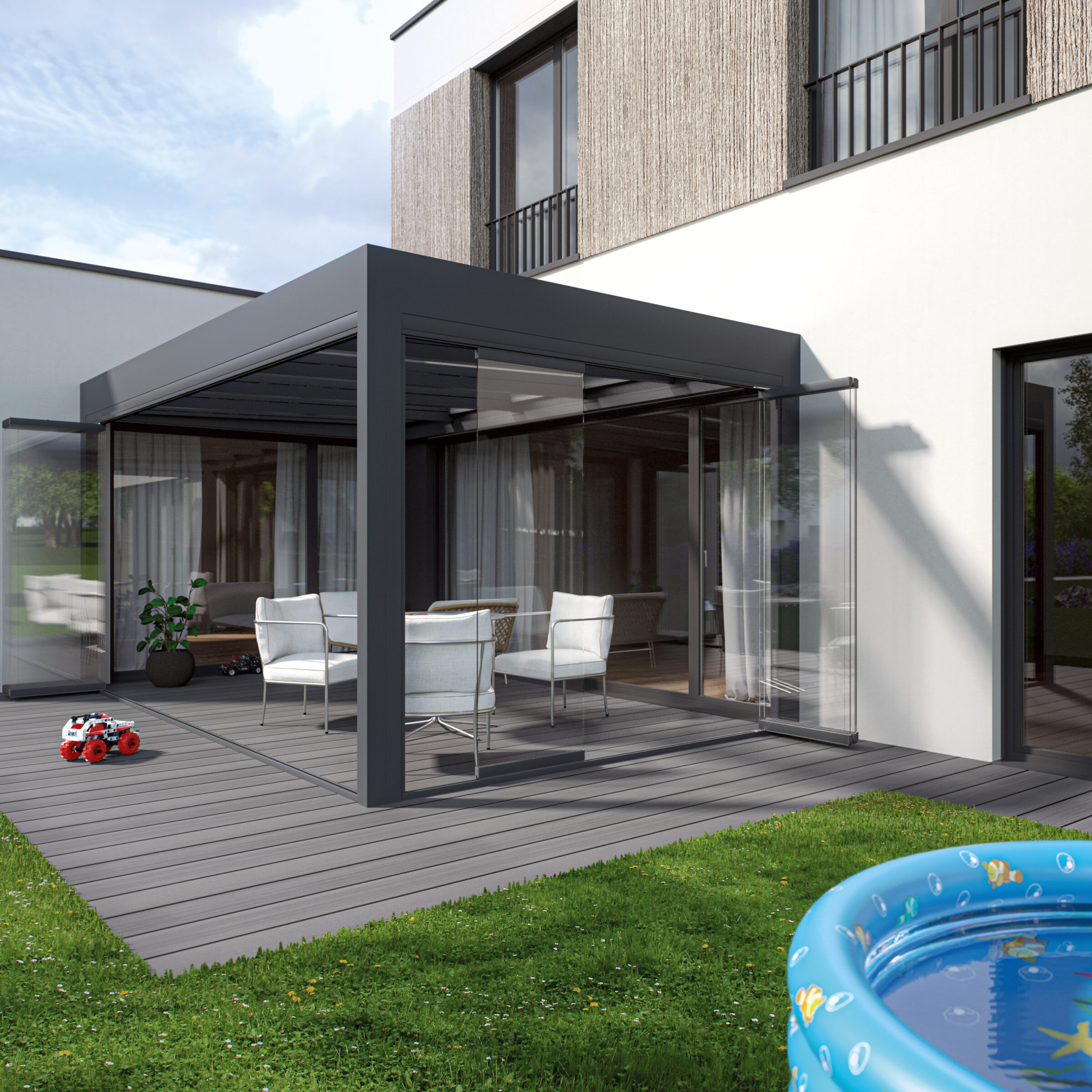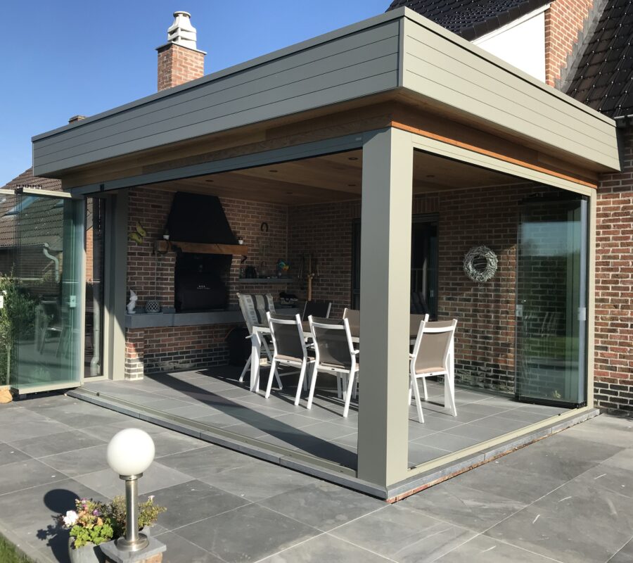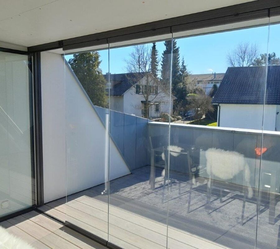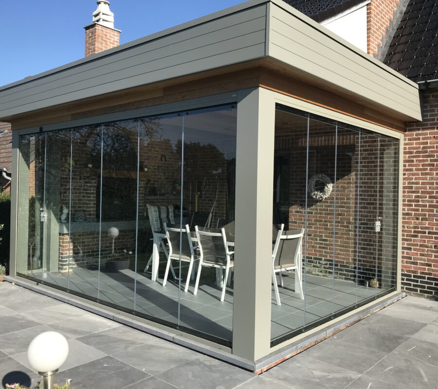 Med sine rammeløse glassflater beholder man utsikten og dagslyset inn mot boligen samtidig som man kan sitte ute beskyttet mot vær og vind.